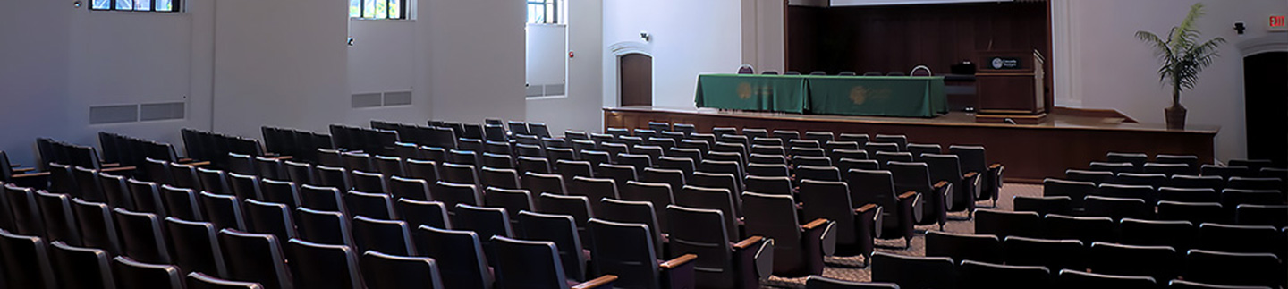 343 stadium style seats fill the floor of the auditorium. The stage is outfitted with a variety of audiovisual controls. For those who wish to be a little less hands-on, the digital displays and screen can be controlled from the sound booth in the former chapel balcony.