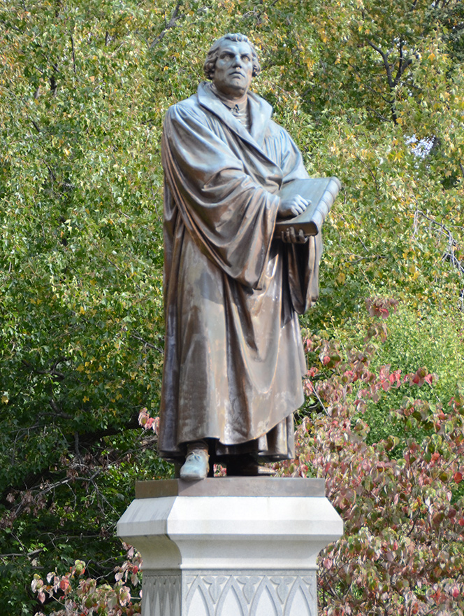 On the east side of campus stands a statue of Martin Luther, across from Luther Tower and the Walther Archway.