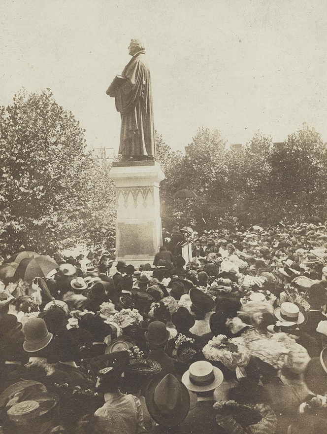 The statue is a replica of the original Luther statue in Worms, Germany, where Luther made his famous “Here I Stand” speech. The statue was originally dedicated at the Seminary’s former location on Jefferson Avenue in 1903. It was moved to the current campus in 1926. The bronze statue is more than 9 feet tall and the granite base is more than 12 feet tall.