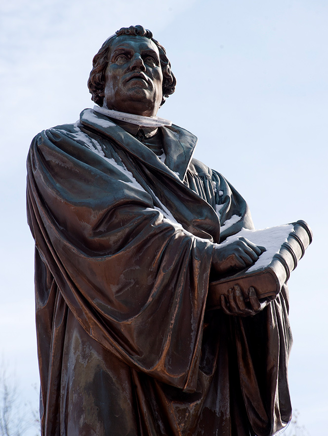 The statue depicts Luther holding the Bible, which he translated into German from the original languages. His right hand rests upon the Bible to signify that all of his teachings are based on Scripture alone. The statue shows a mature Luther whose hairstyle and robes are those of an academic, not a monk.