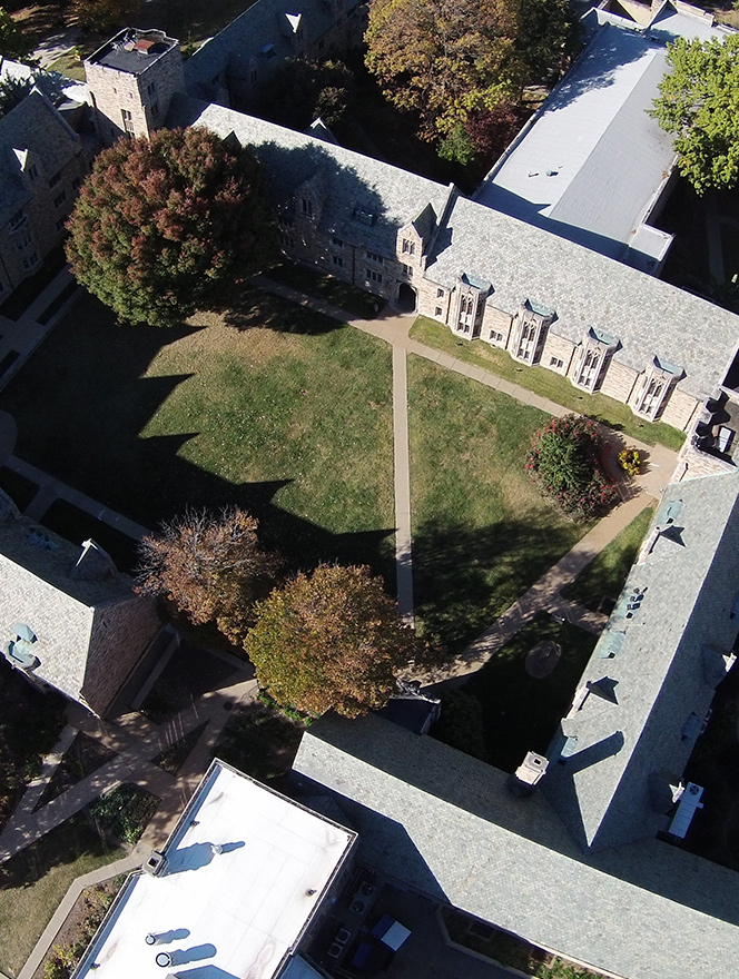 The quad — which features a large grassy area, crisscrossed by sidewalks — is surrounded by Schaller Hall, Guenther Hall, Stoeckhardt Hall and Pritzlaff Hall. Notable offices housed in those buildings include the Presidents Room in Pritzlaff Hall, which served as the reading room for the original library and displays the portraits of the Seminary’s past presidents, the Ministerial Formation offices in Pritzlaff Hall, and the Admissions and Financial Aid offices in Stoeckhardt Hall.