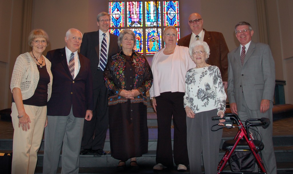 Dr. Walther’s descendants who attended the celebration, from left to right: Joan Hocker, Rev. Richard Holz, Terry Wolf, Deborah Walther Aubochon, Sandra Walther, Walt Busch, Edna Walther Wolf, and Dr. Dale A. Meyer.
