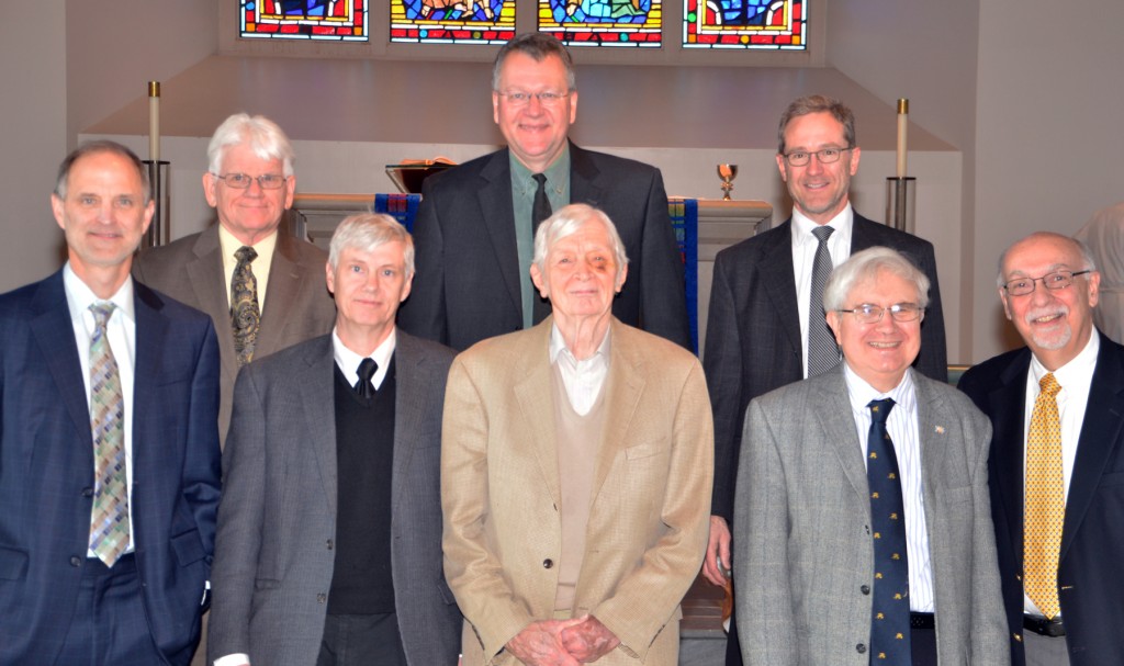 In the photo, front row, from left: Timothy Saleska, Glenn Nielsen, Louis Brighton, Robert Kolb, Bruce Hartung; back row, Robert Weise, William Utech, and Joel Biermann.