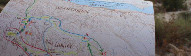 The photo at left is second-year student Andrew Jones’ map of Joshua 10. It shows Joshua’s trek from Gilgal (at the top with the green arrow going down) to Gibbeon, Beth Horon, and Azekah. Other landmarks such as the Aijalon Valley, marked in brown, also are noted. Beyond the edges of the map, the actual landscape of the region can be seen. “It was a long day for Joshua and a long day for us as well,” Jones said. “It’s overwhelming in a way to behold all this. To think these characters actually ran through here. They lived and fought and died in this region—from Abraham to Joshua to David to Solomon, and continuing on to Jesus Himself.”