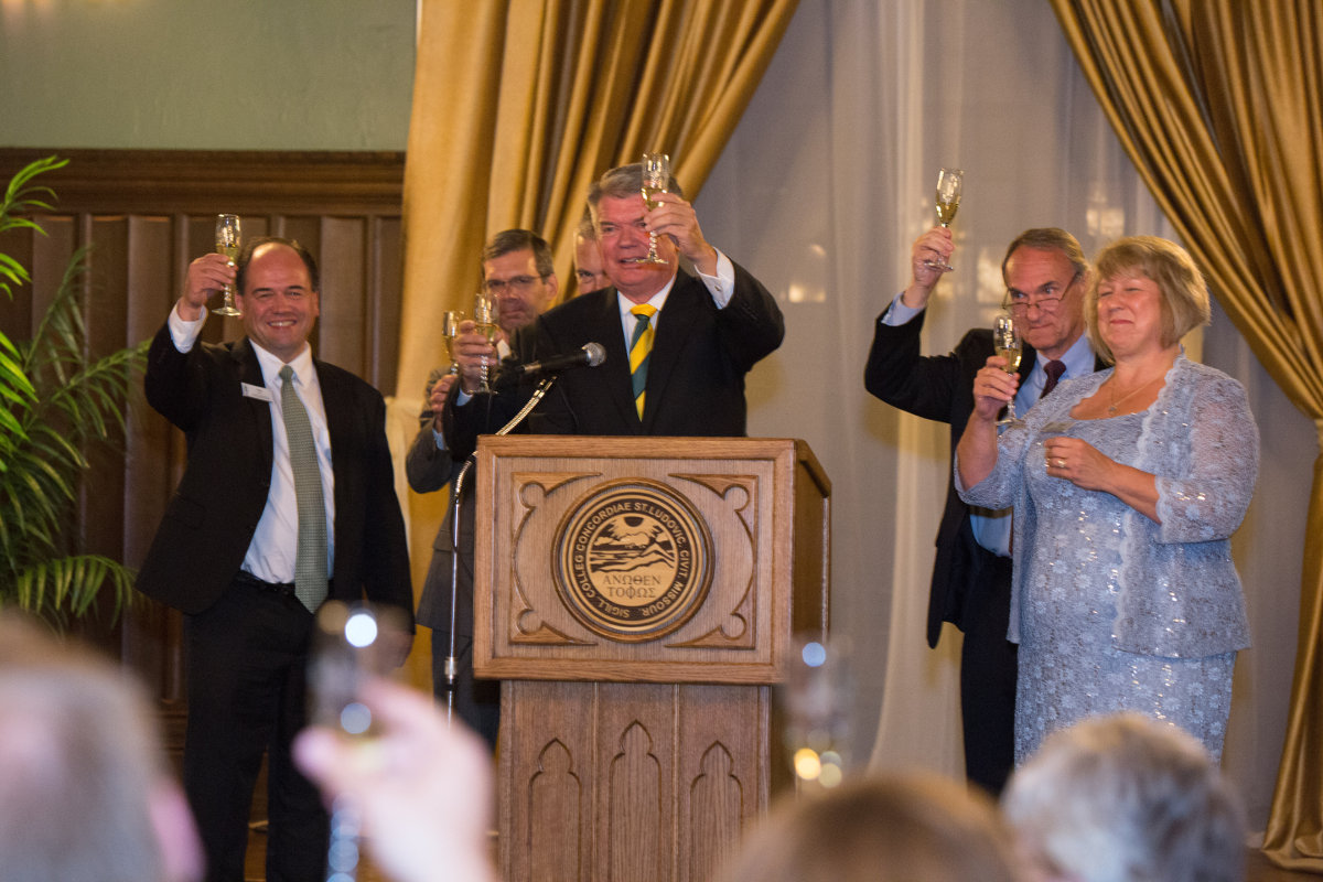 Seminary President Dr. Dale A. Meyer, center, raises a toast as he announces the public phase of the Generations Campaign on