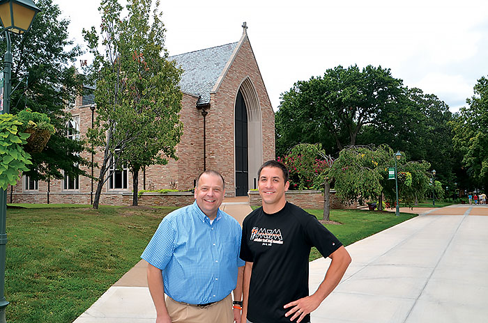 Rev. Bill Wrede, director of ministerial recruitment and admissions, is often known as Father Ted, a name he picked up while working in New York City. He often can be seen talking with students around the campus such as fourth-year student Eric Hauan.