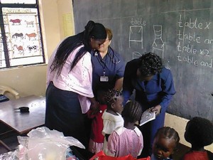 Christine Ouko, right, helps the children of the Kibera slums during a free medical camp in 2009 offered by a Lutheran Church—Missouri Synod church. This picture was taken after the post-election violence in Kenya, which left many people in dire need of health care.