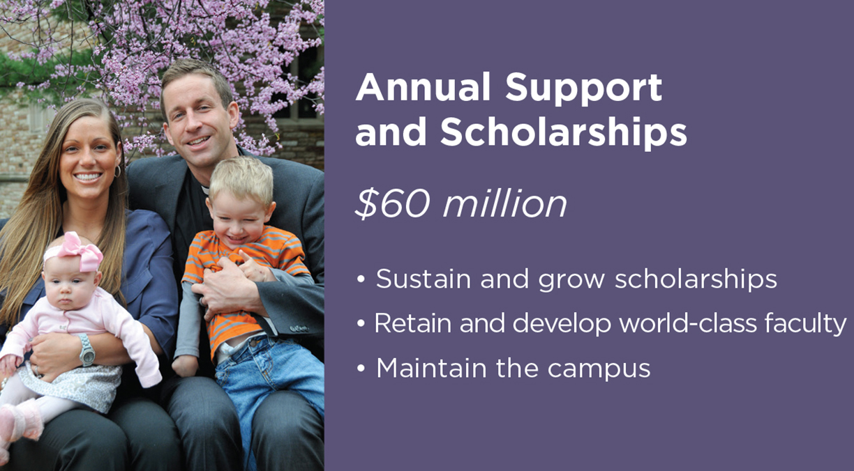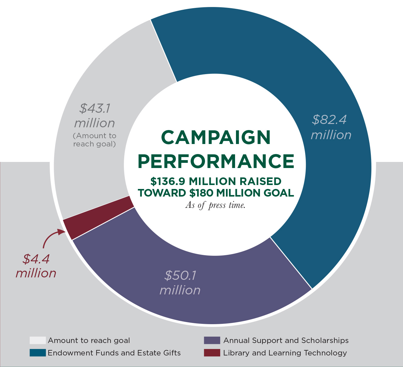 To date, the campaign has raised more than $136 million in gifts and pledges toward a $180 million goal. The campaign seeks to build endowment, increase annual support and scholarships, renovate the library and enhance learning technology.
