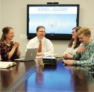 Tara Wolf, director of Christian education, and the youth and family minister, and King of Glory Senior Pastor Bill Harmon meet with former interns Sara Scungio and Harry Grimes, who are now students at Concordia University Chicago, River Forest, Ill.
