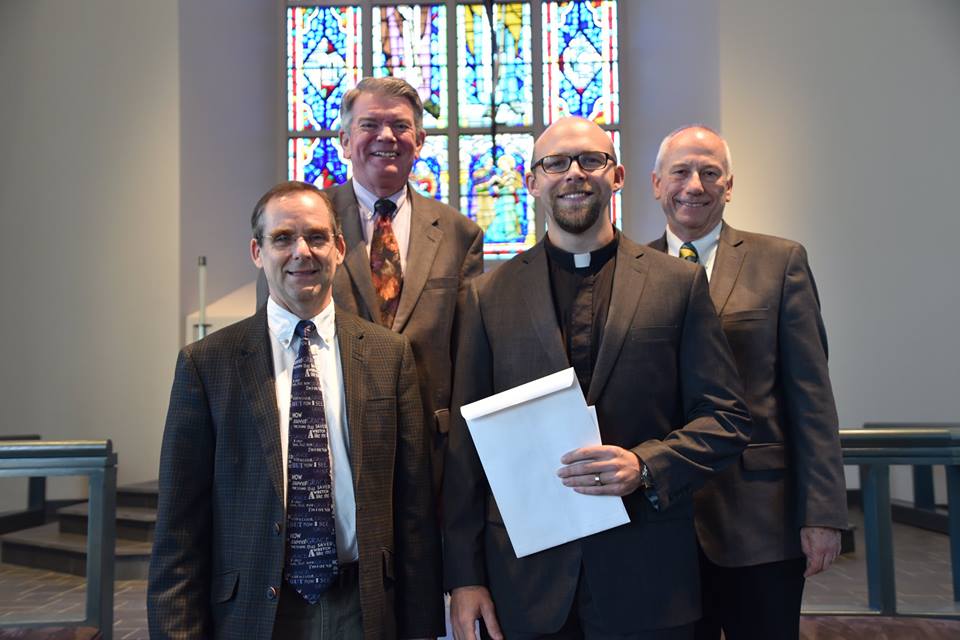 James Prothro, center, received a call to Trinity Lutheran Church in Park Hills, Mo. Also pictured, from left: Dr. Rick Marrs, director of the Master of Divinity and Residential Alternate Route Programs; Seminary President Dr. Dale A. Meyer; and Dr. Wallace Becker, director of placement.