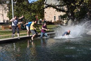 Our fall Greek students celebrated passing the class with a celebratory jump into the fountain Nov. 10. It was a chilly 62 degrees in St. Louis, but the guys jumped right in!
