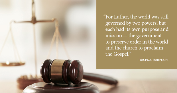 Martin Luther set out to correct this situation. He believed European rulers were suffering from an identity crisis. “The princes want to be bishops, and the bishops want to be princes,” he wrote in 1523 in On Secular Authority. This treatise is his most famous statement of what has come to be known as the two kingdoms doctrine. He rejected the idea that the Roman church should be a political power, owning vast amounts of land and making its own rules. He also rejected the idea that secular rulers should enforce matters of belief by coercion. Instead, he upheld secular government as established by God. This was a radical statement at the time, because the church had asserted that secular rulers couldn’t even be good Christians since they had to enforce laws with violence. Luther claimed instead that God had established government and the vocation of ruler to carry out his purposes in the world, even if those were purposes of applying the law. For Luther, the world was still governed by two powers, but each had its own purpose and mission — the government to preserve order in the world and the church to proclaim the Gospel. Rulers were freed from the overreach and oversight of the church in political matters, but also were to allow the church its own freedom to preach and teach.