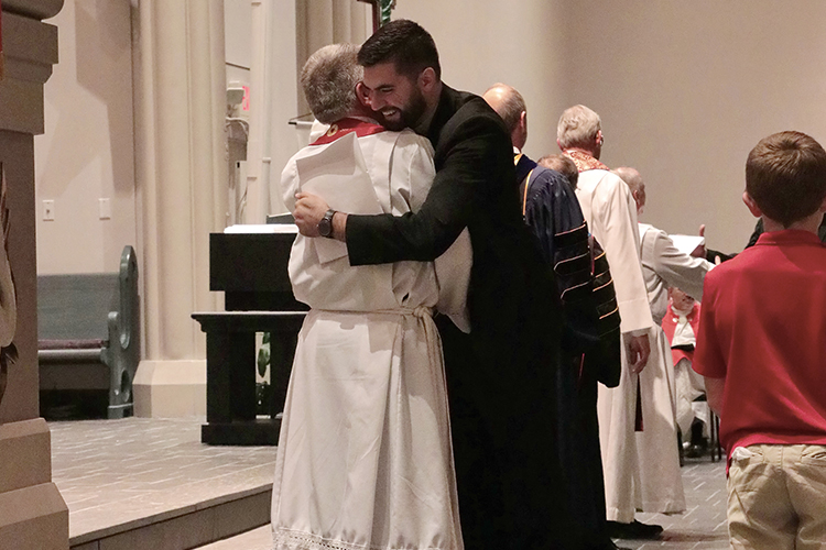 Seminary President Dr. Dale A. Meyer, left, gives Dustin Atkinson a hug on Call Day 2017. Photo: Harold Rau