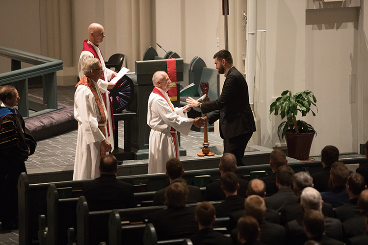 A spattering of applause and an audible “ooh” could be heard throughout the chapel on the evening of April 26, 2017, Call Day, as Atkinson stepped forward to receive his first call into ministry. Standing 6-foot-8, Atkinson towered over Becker as he shook his hand.