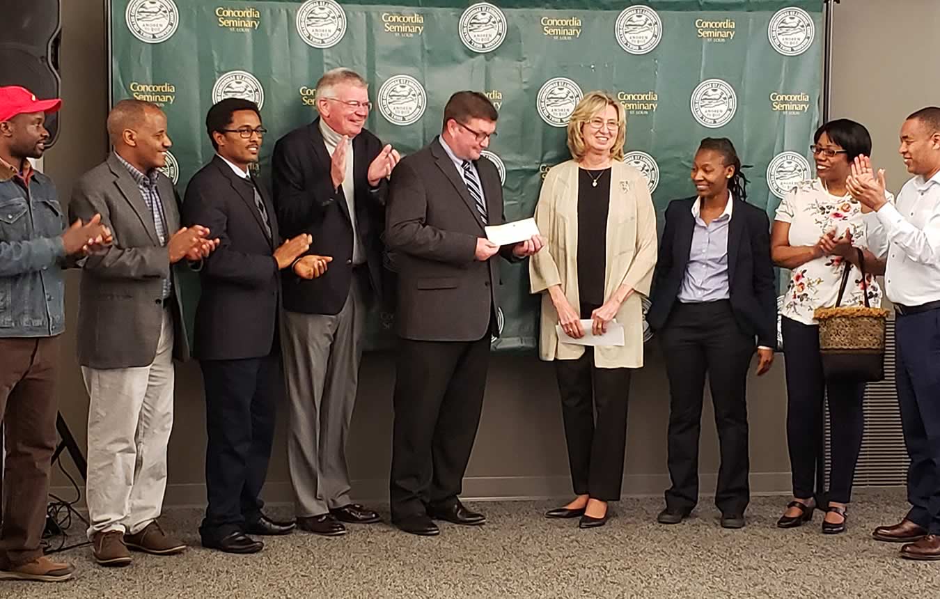 A special check presentation ceremony and cocktail reception was held in the lobby of the Kristine Kay Hasse Memorial Library March 26 to celebrate a generous gift made by the LWML in support of Graduate School students who hail from West African countries. Students, faculty and staff were invited to attend. Patti Ross, president of LWML, presented a check to the Seminary for $40,000. This grant will help fund the education costs for Graduate School students from African countries, including helping toward tuition, fees, room and board, health insurance and even students’ travel costs back to their families in West Africa once their education is complete. Doctoral student Rev. Tibebu Teklu Senbetu, one of the Seminary’s students from Ethiopia, gave a firsthand account of how the gift will help prepare future pastors from his country.