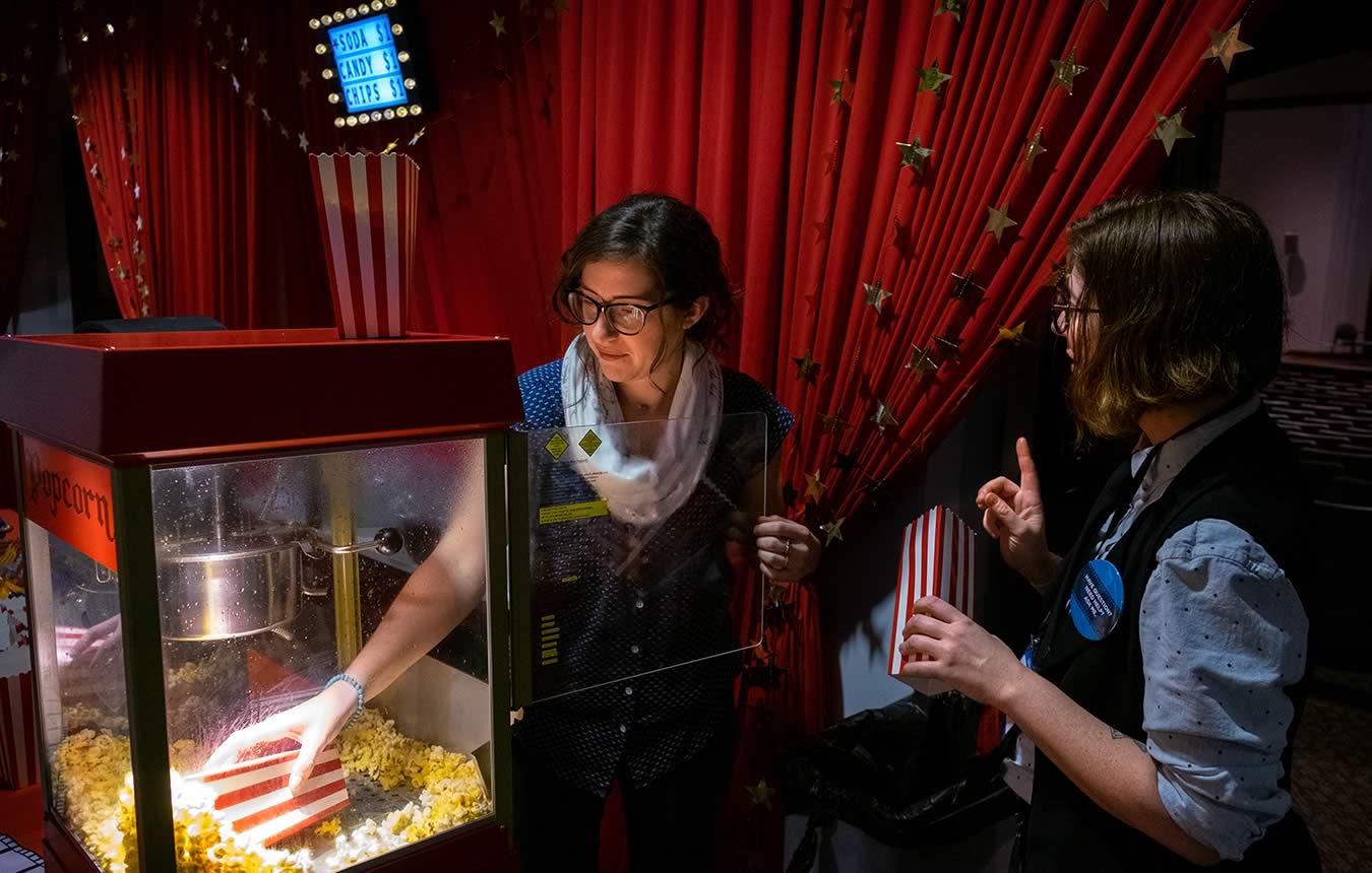 Seminary wife Anna Otterman, left, fills popcorn containers with the help of Campus Events Coordinator Natalie Piacentini.