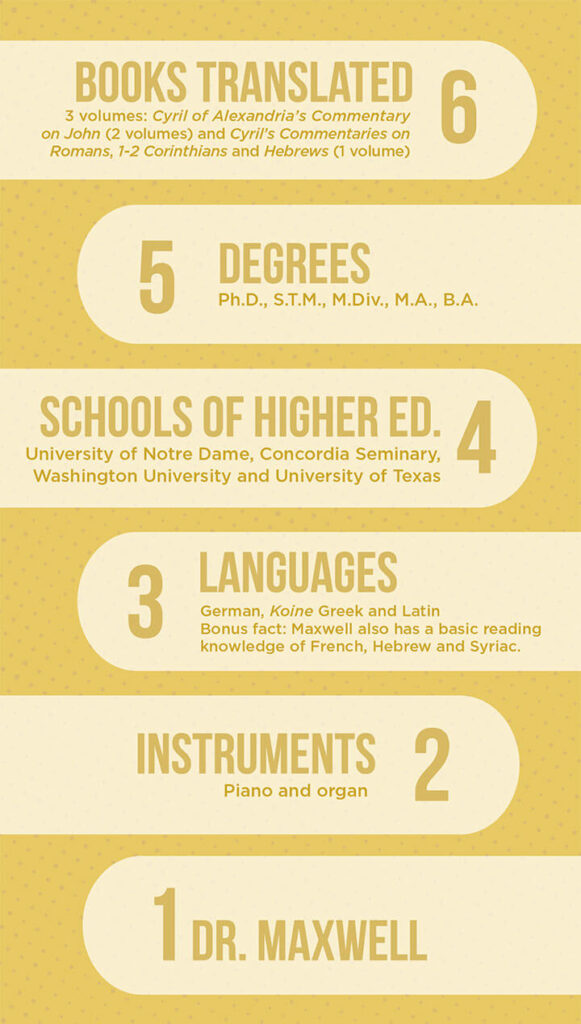 Maxwell joined the Concordia Seminary faculty in 2004. As he was translating Cyril of Alexandria’s Commentary on John (InterVarsity Press), Maxwell wondered how the early church read the Bible? Not just what they say about justification, but their approach to the biblical text in general?