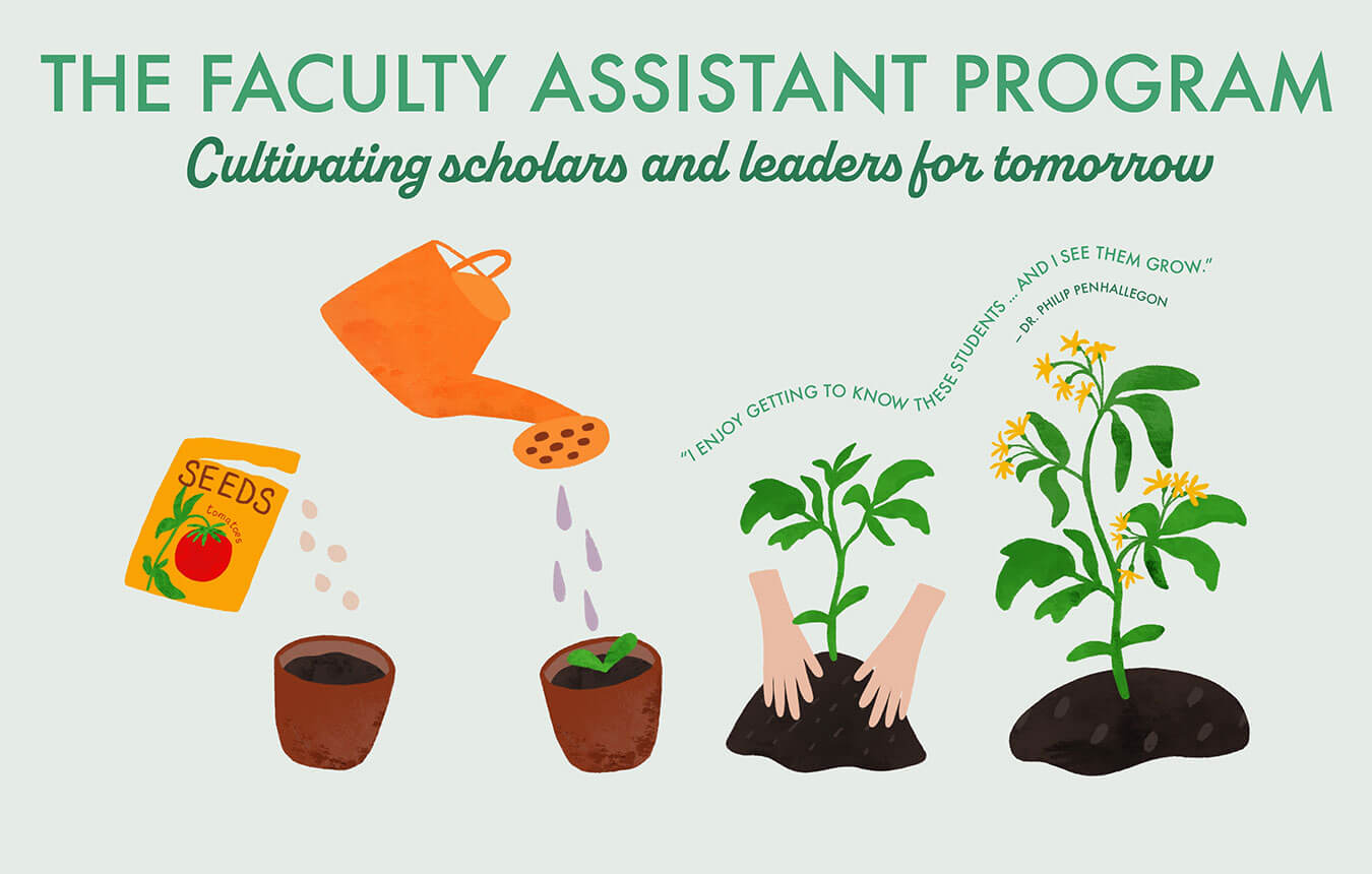 So how does this program prompt a student to consider a career in academia? “It starts with inspiration,” says Provest Dr. Ron Mudge. “Our faculty does this somewhat informally, saying to a student they might make a good professor, planting the idea in the mind.” Inviting a student to participate in the faculty assistant program helps in that process.