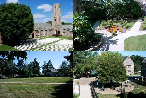 Left to right, top to bottom: Main Quad, Academic Quad, Cabin Gardens, Benidt Plaza