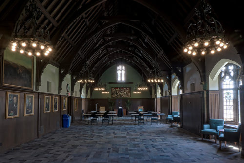 Named after a German castle that served as a haven to Martin Luther, Koburg Hall once functioned as one of the two original dining halls. The Collegiate Gothic style is exemplified in the high Tudor style arches of the vaulted ceiling and the large carved stone fireplace. Chandeliers and many original stained glass windows provide lighting.