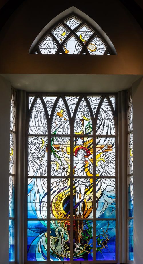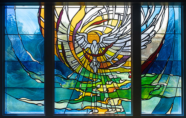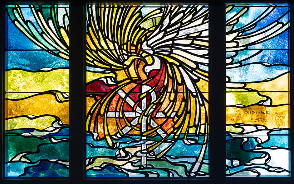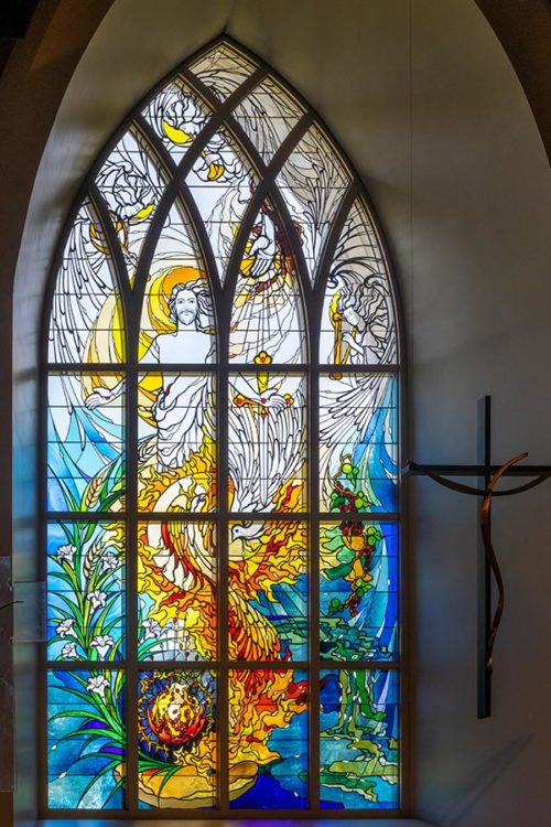 Nearby is an Easter lily. The phoenix, an ancient symbol of rebirth, rises from the bottom and greets the Holy Spirit, depicted as a dove. The Spirit’s descent amid the fire serves as a reminder of Pentecost.