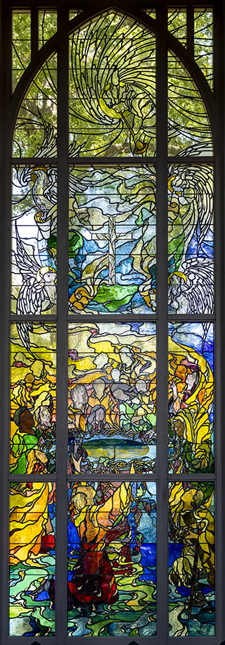 The River of Life continues to flow through these windows, calling God’s people to celebrate now in hope of the New Creation. Such anticipation is seen in the eagle who looks toward the return of Christ and the figures whose robes begin to change to jewel-like tones. Indeed, all who gather around the eucharistic table participate in a foretaste of the feast to come.