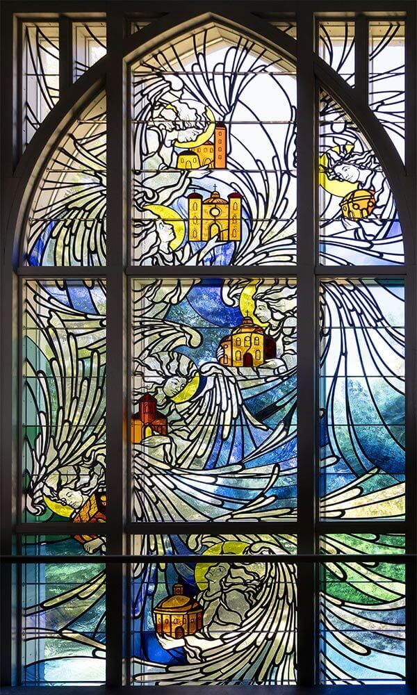 The rest of the windows can be seen from the balcony on the second floor of the chapel. As Abraham was given a vision of his descendants as numerous as the stars, John is given a vision of the seven angels and the seven churches. While their number of seven represents wholeness, each church is architecturally distinct. This vision captures the unity in diversity among God’s people throughout the world as John sees how God’s promise that Abraham would be a blessing for all nations is fulfilled in Christ. -