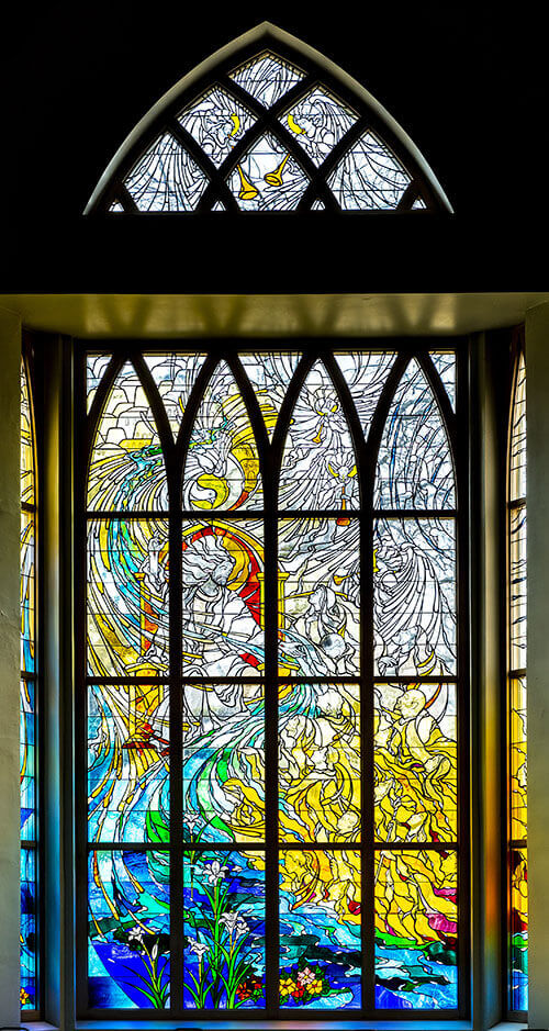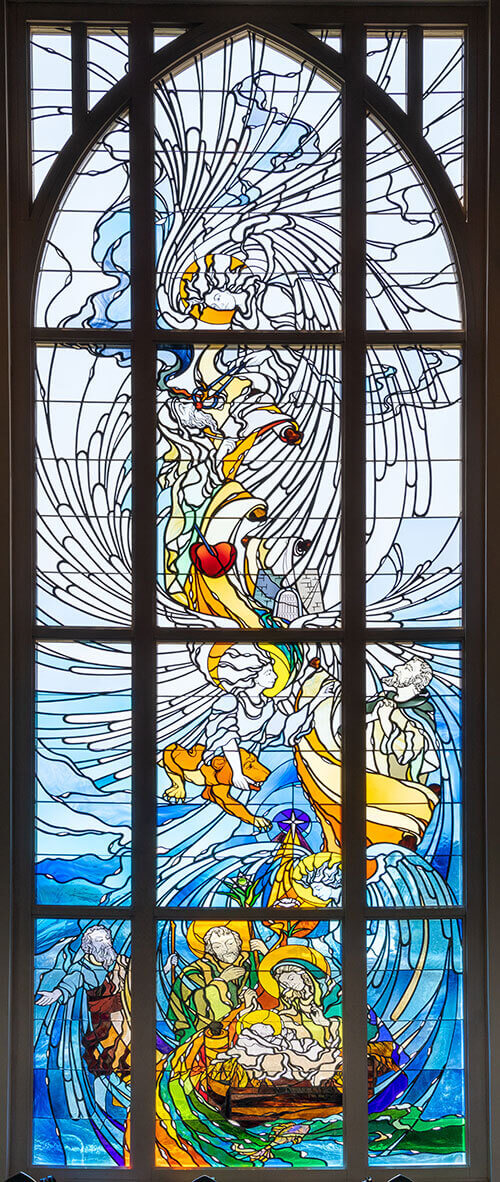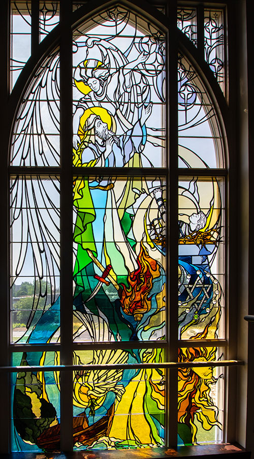 The rest of the windows can be seen from the balcony on the second floor of the chapel. From the second floor, the story continues as Noah’s Ark emerges from a storm. The dove approaching the Ark represents God’s reconciliation with man. Above the Ark is a depiction of Abraham at the moment God stops him from sacrificing his son, Isaac, and instead gives him the promise that his descendants will be as numerous as the stars in the sky.